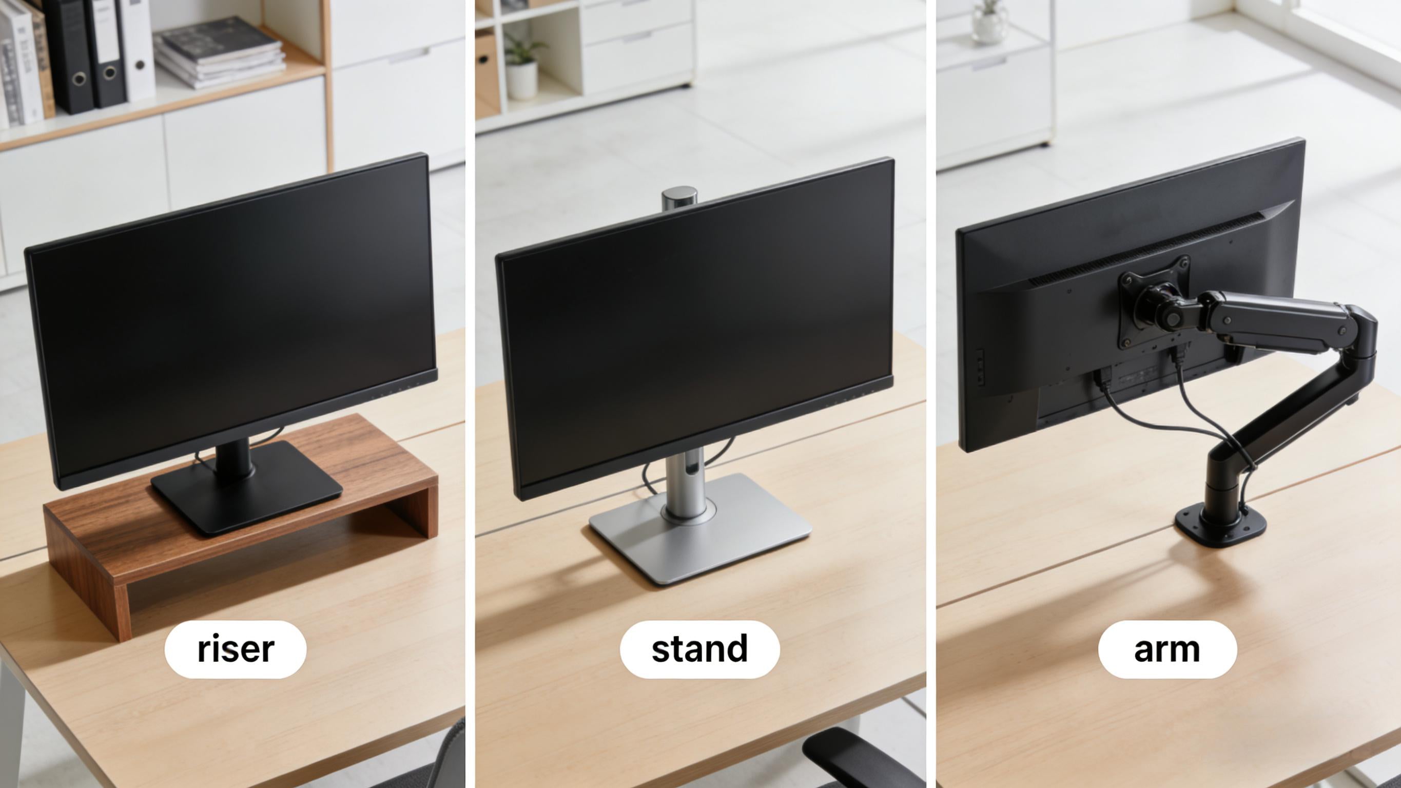 Visual comparison: riser vs fixed stand vs articulating arm.